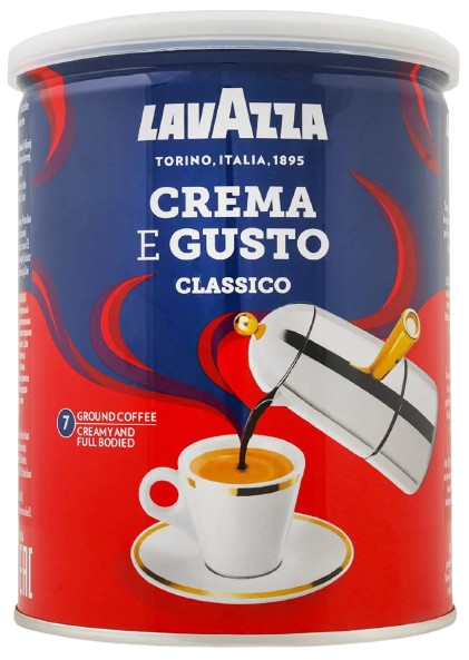 Кава мелена Lavazza Crema e Gusto. Сорт кави: купаж арабіки (30%) і робусти (70%). Ступінь обсмажування: темний.